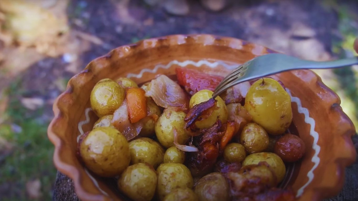 Молода картопля та ковбаски. Фото: YouTube @nashi.besahy